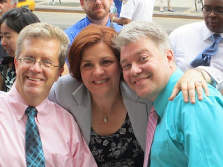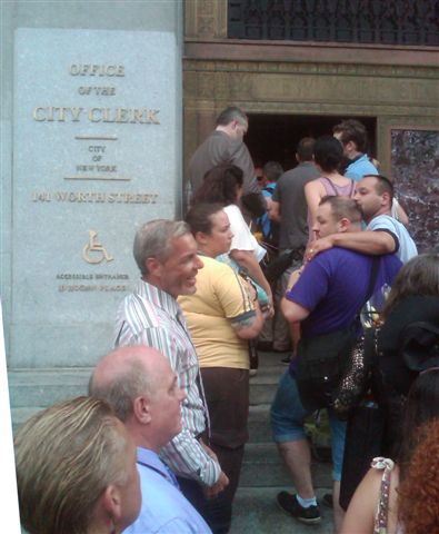 Couples began exchanging vows at midnight from Niagara Falls to Long Island, though the center of the action was in New York City, where officials expected to host hundreds of same-sex weddings throughout the day. About 100 couples waited in line on a sweltering morning in Manhattan for the chance to exchange vows at the city clerk's office. WE WERE PART OF THIS HISTORIC HAPPENING!And tonight we have been seen nationally. I was even told that I was seen in France!